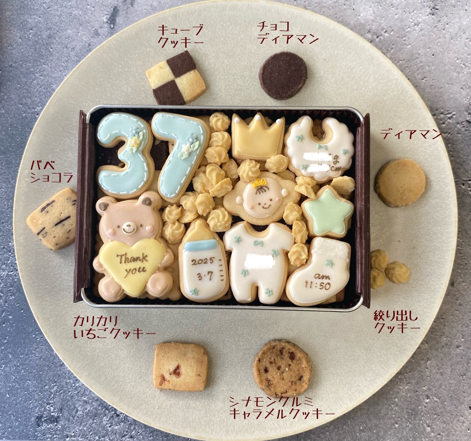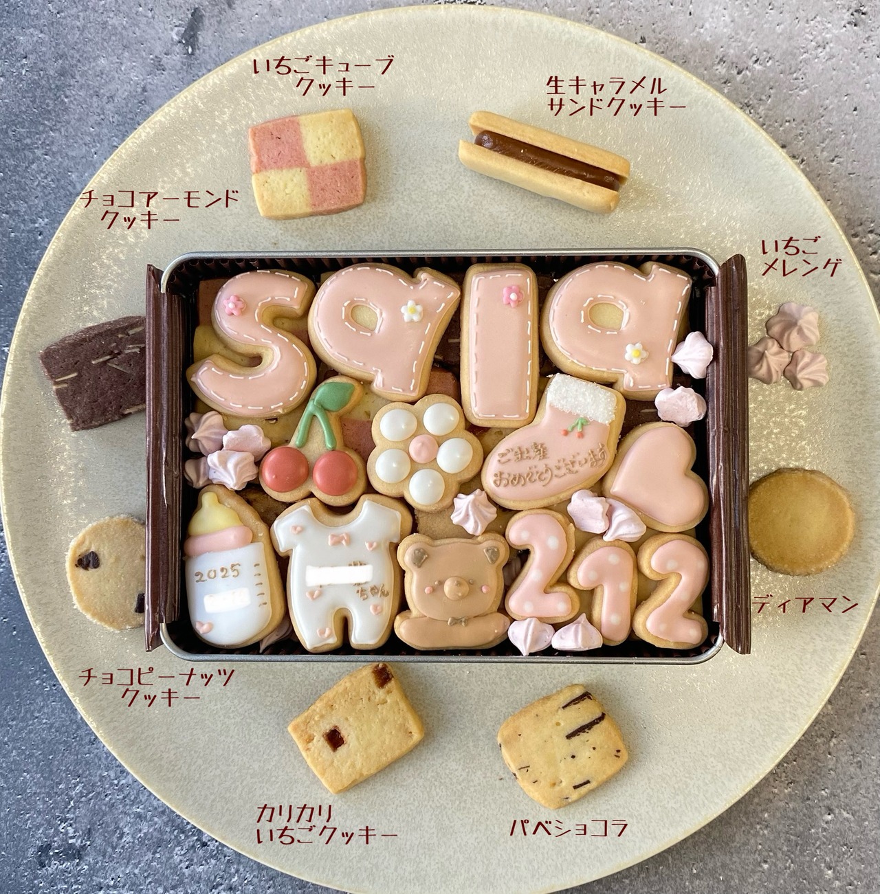 赤ちゃんシリーズにはお名前、出生日時などお入れしたかわいいアイシングクッキー♡
