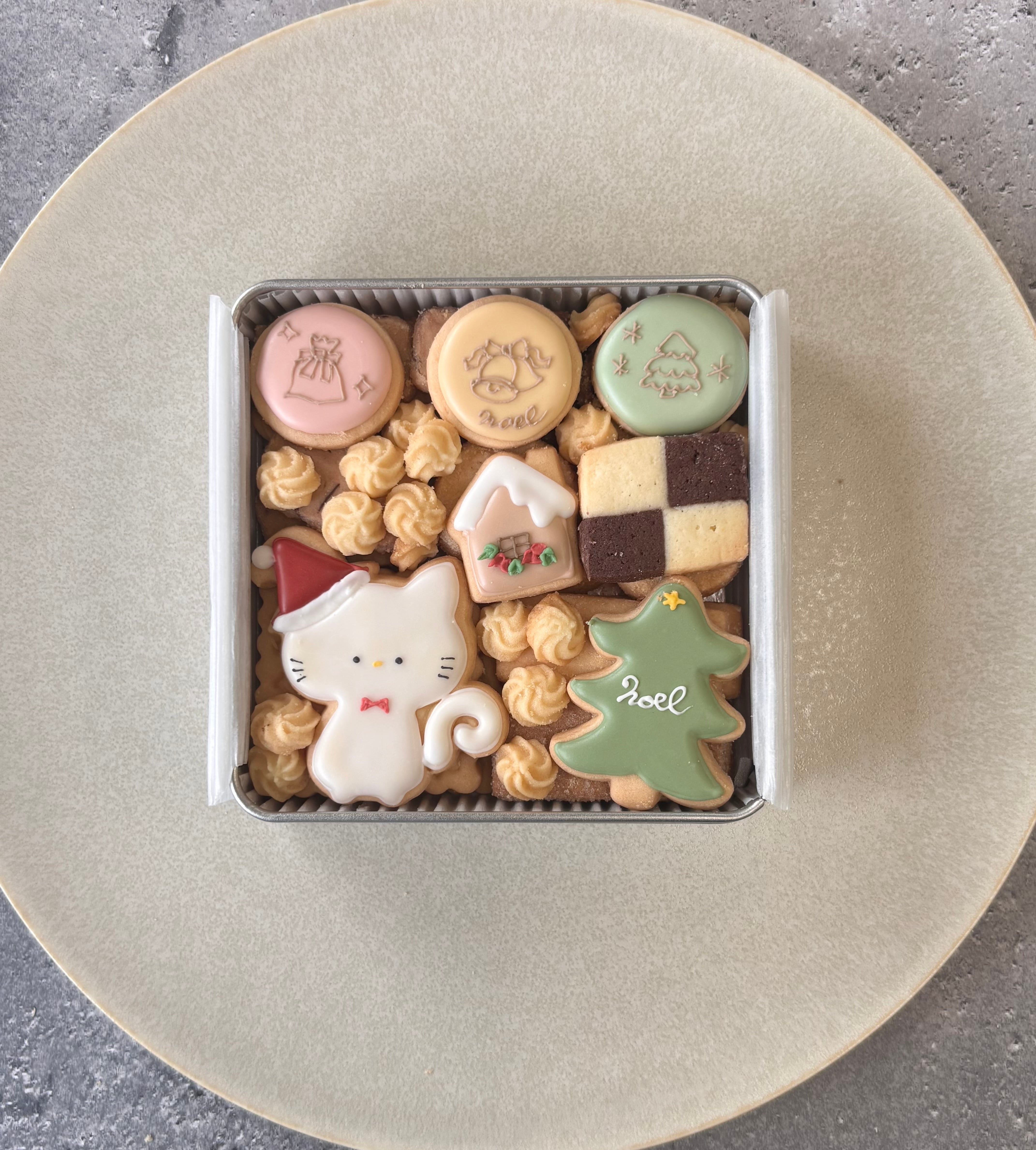 優しい配色のアイシングクッキーにクリスマスモチーフをひとつづつ描いて仕上げたアイシングクッキーを詰め込んだかわいいクリスマスクッキー缶です
